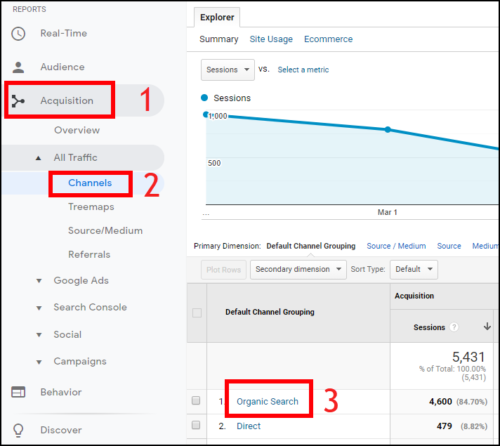 Start by opening the Acquisition tag, then Click All Traffic > Channels > Organic Search