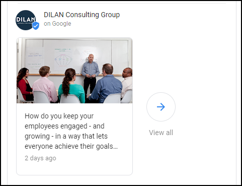 You can think of it like Instagram on Google, but with a bit more of a content-marketing twist. These posts will show up in your Google My Business listing at the right of Search Engines, like this example from DILAN Consulting in California: