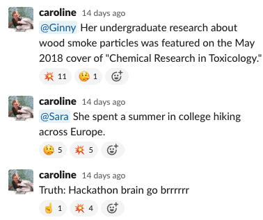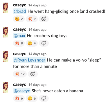 Team slack challenge: “Where’s the lie?!” in which we try to spot untruths about our esteemed colleagues…