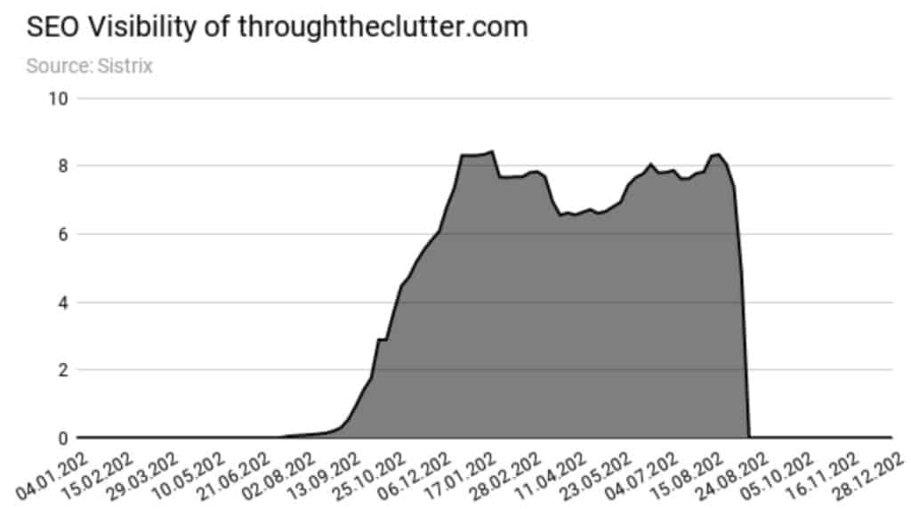 The theoretical future Google penalties described above aren’t all theory. We have examples already of websites with full, sitewide penalties. Here’s a search traffic graph from one such site: