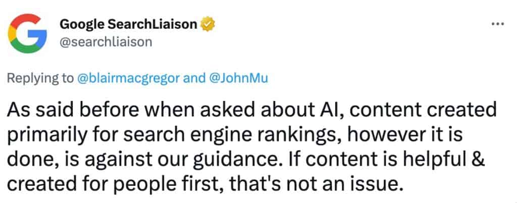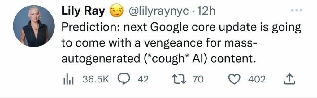 If you’ve been around SEO for any length of time, Lily Ray needs no introduction. And this tweet needs little explanation. Lily is predicting that what happened to the sites from the case studies way back in Thing #2 will be happening big time in the near future—a specific Google AI content update, or a broader algorithm update that includes stuff designed to target AI-written-content.