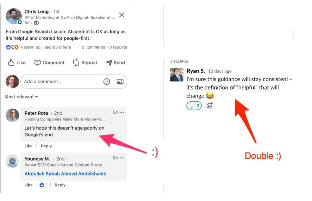 Hold on to your hats, folks, things are about to get meta. In the screenshot below, check out what this gentleman Peter, who’s clearly seen this Google-makes-statements-on-SEO rodeo before, commented on the LinkedIn thread where this tweet was being discussed. Then check out how our own head of content (and host of the Content Bounce House podcast) Ryan Sargent responded to my 🙂 pointing out that comment in our internal Slack channel: