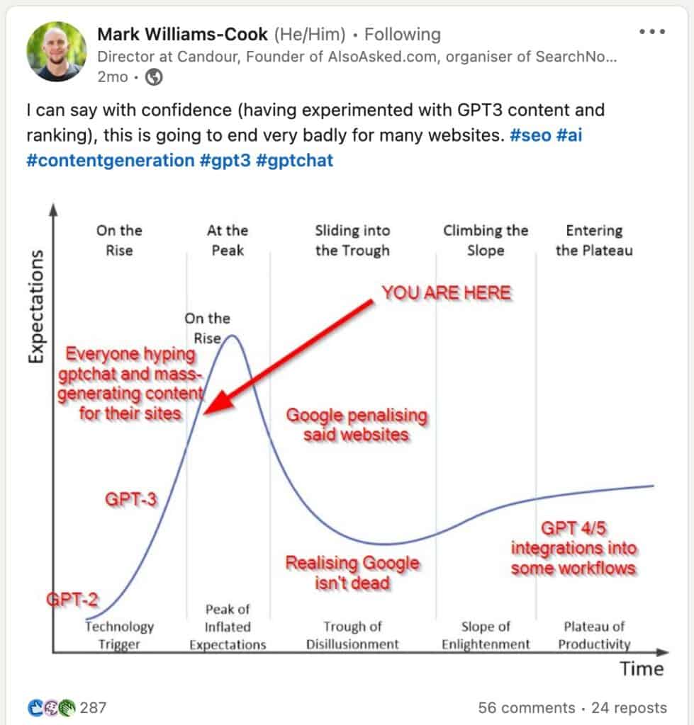 Mark makes another appearance in this article with his adaptation of the classic Gartner Hype Cycle. In this case, the trough of disillusionment is the trough where your website traffic goes to zero. To provide some balance to Mark’s pretty negative outlook here, just note that recent well-informed speculation has GPT-4 arriving sometime in H1 2023. So although Gartner Cycles are often measured in years, this one … may be much faster.