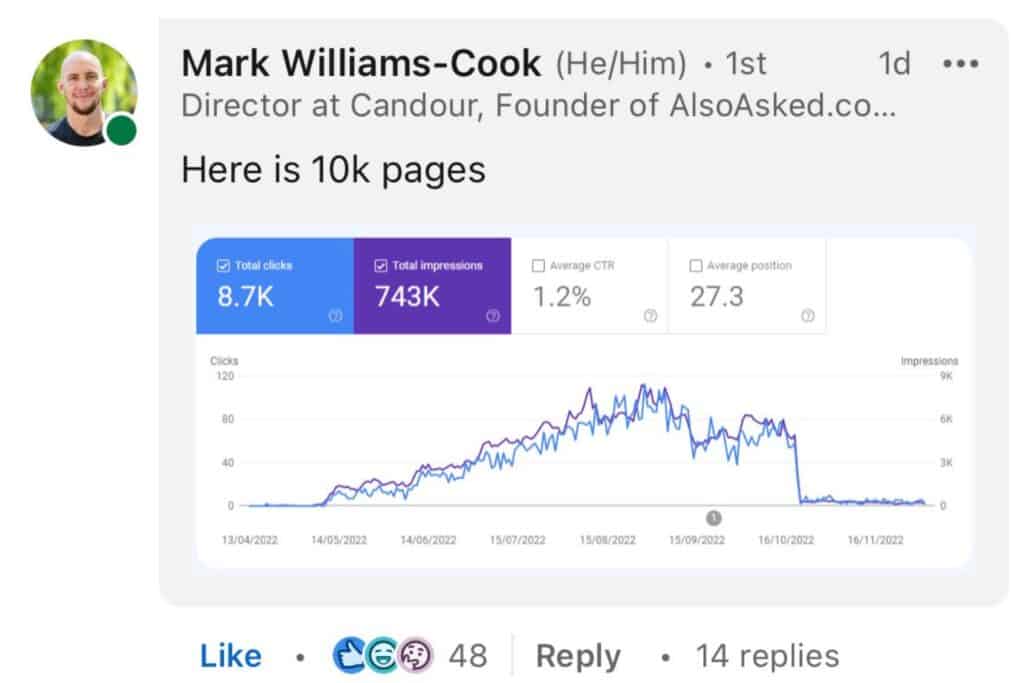 - As Ross Hudgens has been talking about a lot recently, there’s serious danger to publishing at extreme scale very quickly. This could have been the cause of Mark’s penalty, and it had nothing to do with AI. (Personally, I doubt this was the only factor, which leads to …)