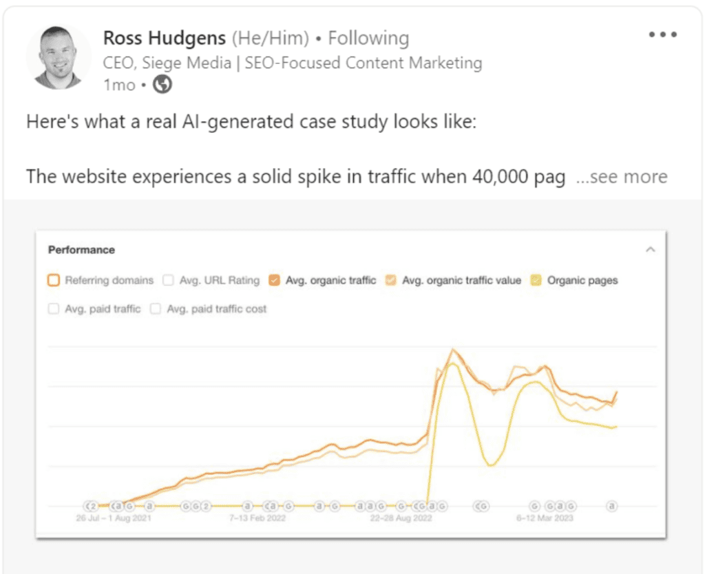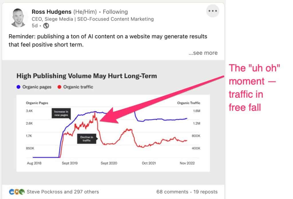 In this LinkedIn post, Ross is commenting on AI content, but specifically using AI content to push publishing velocity (literally, how fast you’re publishing) to extreme and unhealthy levels. This applies to human content, too, but it’s much easier to achieve with AI. The point? In the short-term, extreme publishing velocity may have a positive impact on your organic traffic, but this will very likely come back to bite you. Ross’ theory: If the ratio of content to backlinks starts climbing too fast, the ‘foundation’ of links supporting the content crumbles.