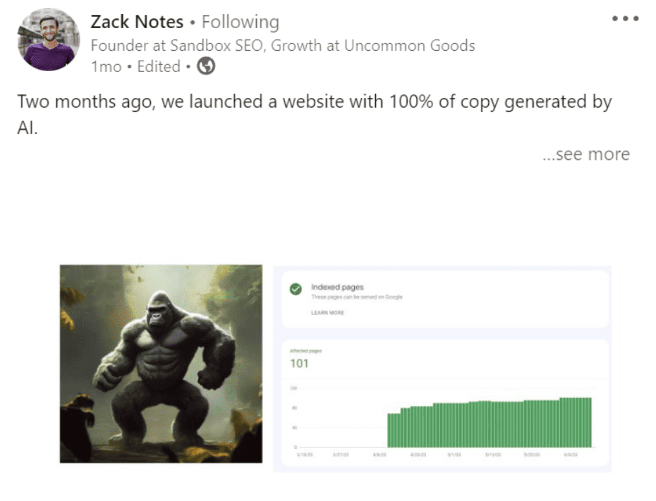 Lots of naysaying from our expert roundup. Do note, though, all three of them use “mass content/high volume” in their posts. We’ve seen Google’s dislike of super-high-volume (particularly low-quality, high-volume) before, so it’s hard to argue against the likelihood of this particular use case for AI content ending badly.