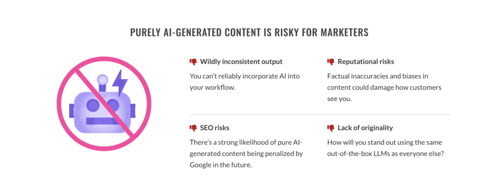Entirely AI-generated content certainly has its use cases — and some serious cost-saving perks. However, without human intervention, AI content doesn’t fit the bill for all of the content our customers need. It’s unreliable, unoriginal, and an SEO risk.