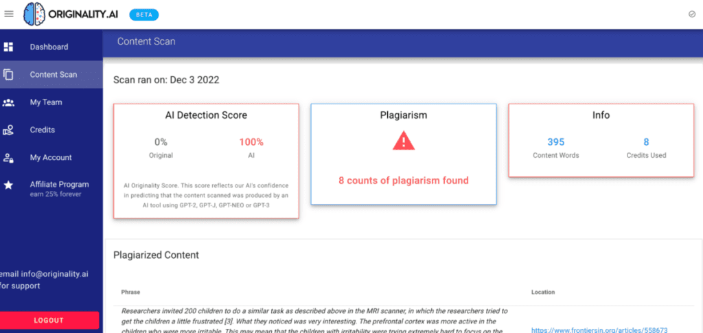 Originality.ai can detect content from OpenAI’s leading tools (GPT-3, GPT-3.5, and ChatGPT) with up to 94% accuracy. Currently, we screen every piece submitted on our platform with this tool, flagging articles likely to be written by AI. Collecting this data allows our internal teams to analyze patterns and identify contributors submitting AI-generated content.