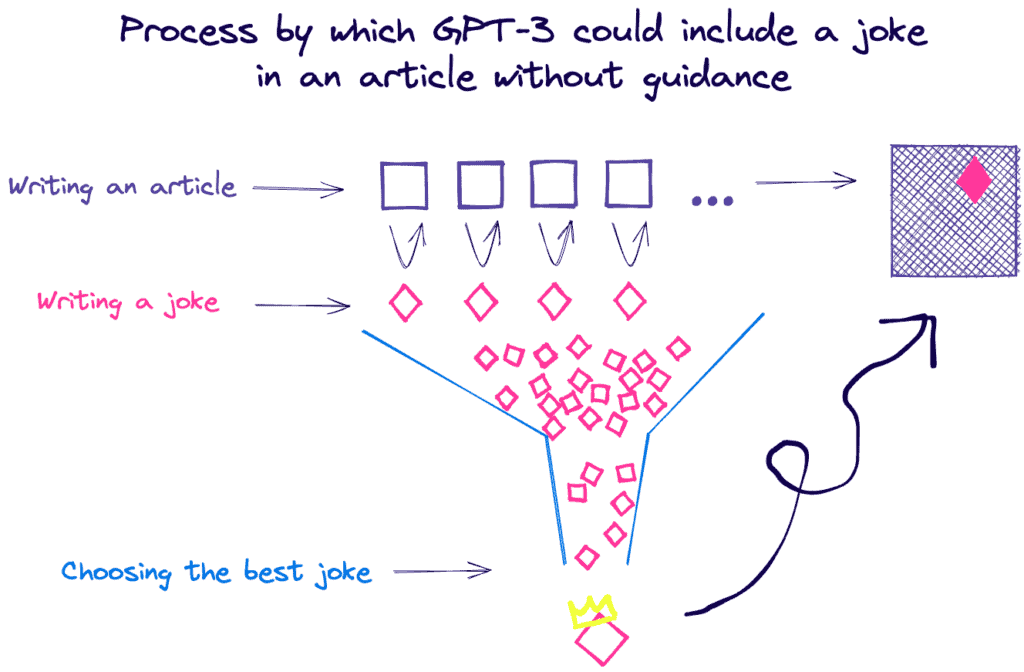 Until it has a more elegant way to do that, it likely would have to be running at least two processes at the same time, similar to the “writing article mode” and “writing joke mode” I mentioned above. In this case, it might look like Process 1 writing the article, Process 2 creating a “joke” around the latest text from Process 1, and then some additional tool like OpenAi’s “best of” parameterlayered on top, to choose the best one from among all the jokes it’s generating, and adding that to the final text.