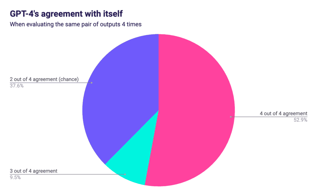 It’s worth highlighting that these stats only measure GPT-4’s consistency when evaluating pairs and don’t even begin to address whether its choice was actually “right,” ie. if it would match a human evaluator’s preference. Precision and accuracy: You need both if you’re going to use AI as an evaluation tool.