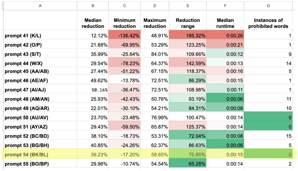 The maximum reduction (column D) isn’t color-coded because I wasn’t aiming for a particular percentage reduction, though the 84 percent reduction for prompt 43 is probably too high. What’s more important for understanding how consistently a prompt behaved is the spread between the minimum and maximum reductions: column E. The lower that number, the more consistent the outputs from that prompt were, which is what we want.