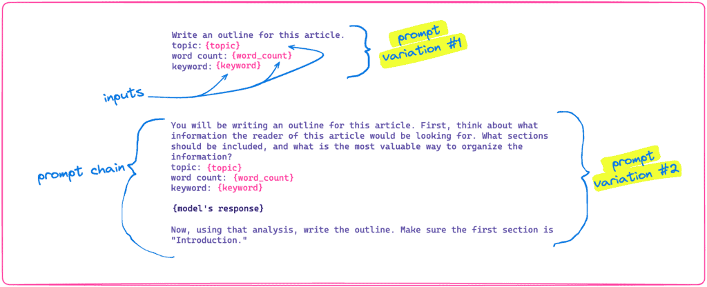 - Prompt variation: If I test multiple different prompts aimed at the same goal, e.g. writing an outline, those are prompt variations. A given variation could be a single prompt, or it could include multiple prompts in a chain.