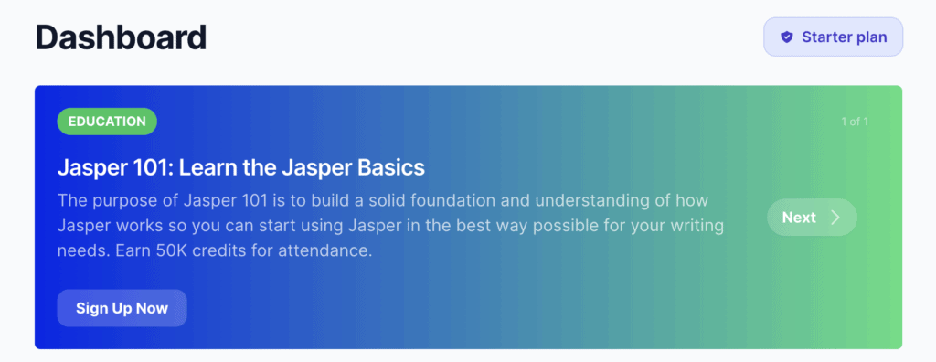 Jasper also has a learning curve. Regardless of your writing ability, figuring out how to use the tool effectively will take some time and effort. The Jasper team recognizes this, which is why they so heavily incentivize going through their “Jasper 101” education.