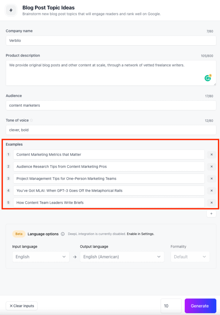 These topics are better and more consistent. They also include some new topics that the original ten didn’t, like talking about metrics and research. (Of course, you will get different results every time you use a template, so it’s hard to definitively say which differences are a result of the extra input.) Overall, though, I feel confident that including examples improved the results, which is one general principle of working with AI writing tools.