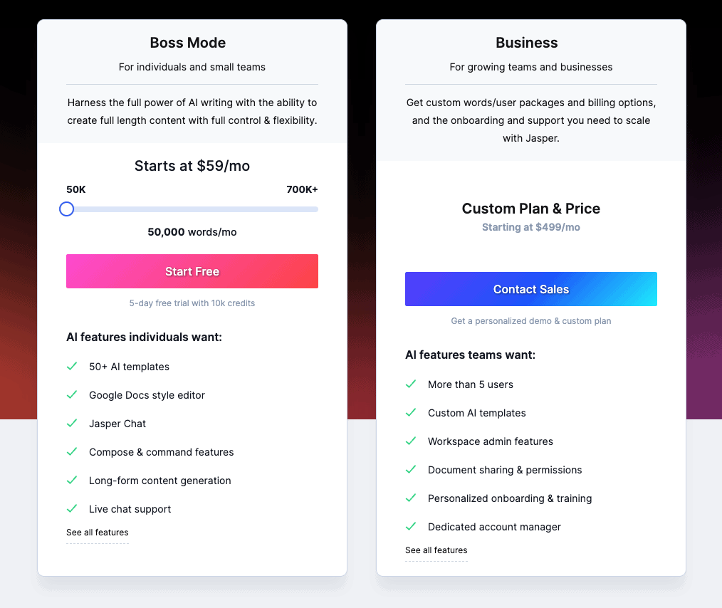 As of February 2023, Jasper’s pricing is very simple. Unless you need an enterprise account with custom pricing, your only option is Boss Mode beginning at $59 per month.