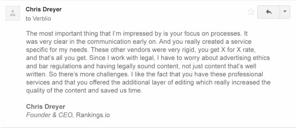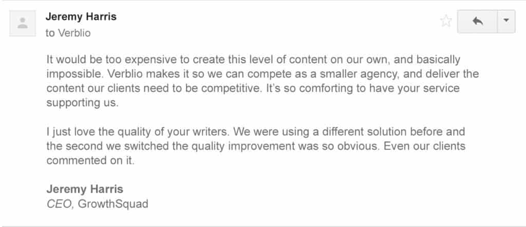At my agency, Verblio solves the problem of us not having any writers on staff. Working with Verblio for the past year has made my life so much easier! They have great writers who submit quality content. I highly recommend their services.