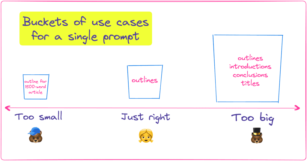 Despite the officialness of my Goldilocks diagram, it’s worth noting that the right-sized bucket isn’t universal.If you’re creating two types of articles that should each have a very different structure—for example, tutorial articles that should follow a step-by-step format with a list of what you’ll need at the top vs. case studies that should follow a problem/solution/results format—using a single prompt for “outlines” could be too big a bucket for you. Instead, you’d likely want to create two different prompts for those two kinds of articles, with each prompt detailing the specifics of the format you’re looking for. This approach would give you better enough results to make it worth the effort of building those two flows.